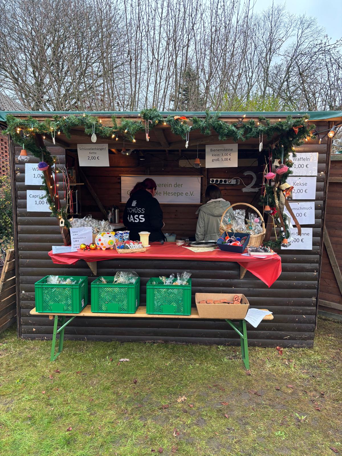 Am zweiten Adventssonntag, wie es die Tradition vorgibt, fand wieder der Heseper Weihnachtsmarkt statt. Dank vieler Helfer beim Aufbau der Buden, vieler Eltern, die sich am Adventssonntag in unsere Bude stellten und vieler engagierter Kinder, die beim Verkaufen mit einem Bauchladen voller Plätzchen und selbst gefertigter kleinen Kunstwerke halfen, durfte sich unser Förderverein über Einnahmen von über 600,-€ freuen. Vielen Dank auch den fleißigen Helfern beim Abbauen der Buden. Ohne die Mithilfe der vielen beteiligten Eltern und unseres Fördervereins, wäre der Weihnachtsmarkt nicht möglich.