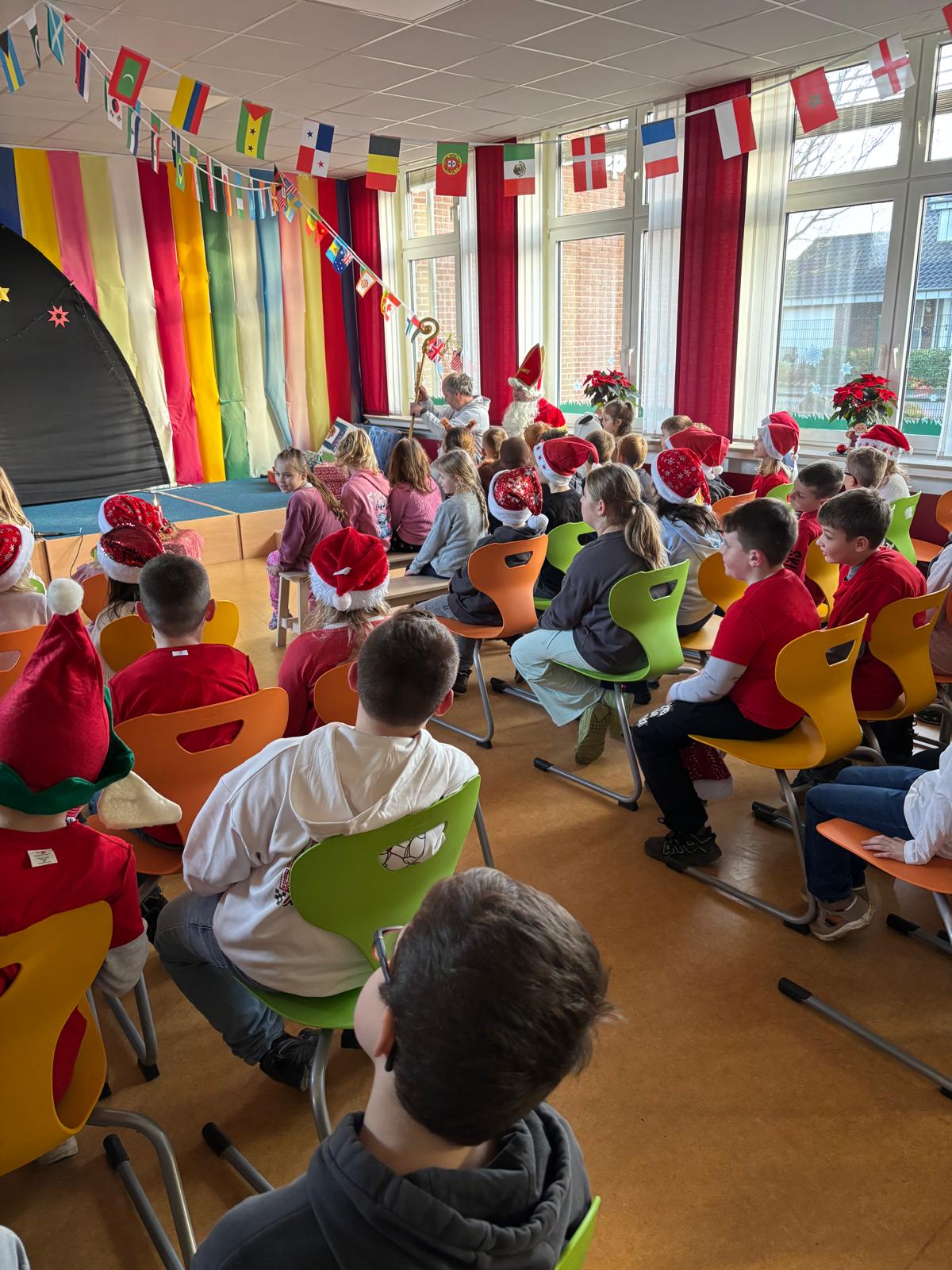 Am Montag, dem 08.12.2025 besuchte uns der Nikolaus in der Schule. Er hat für jede Klasse schöne Geschenke dabeigehabt und darüber hinaus erfreute er dieses Jahr alle Kinder mit einer eigenen Lesetüte. Vielen Dank lieber Nikolaus!