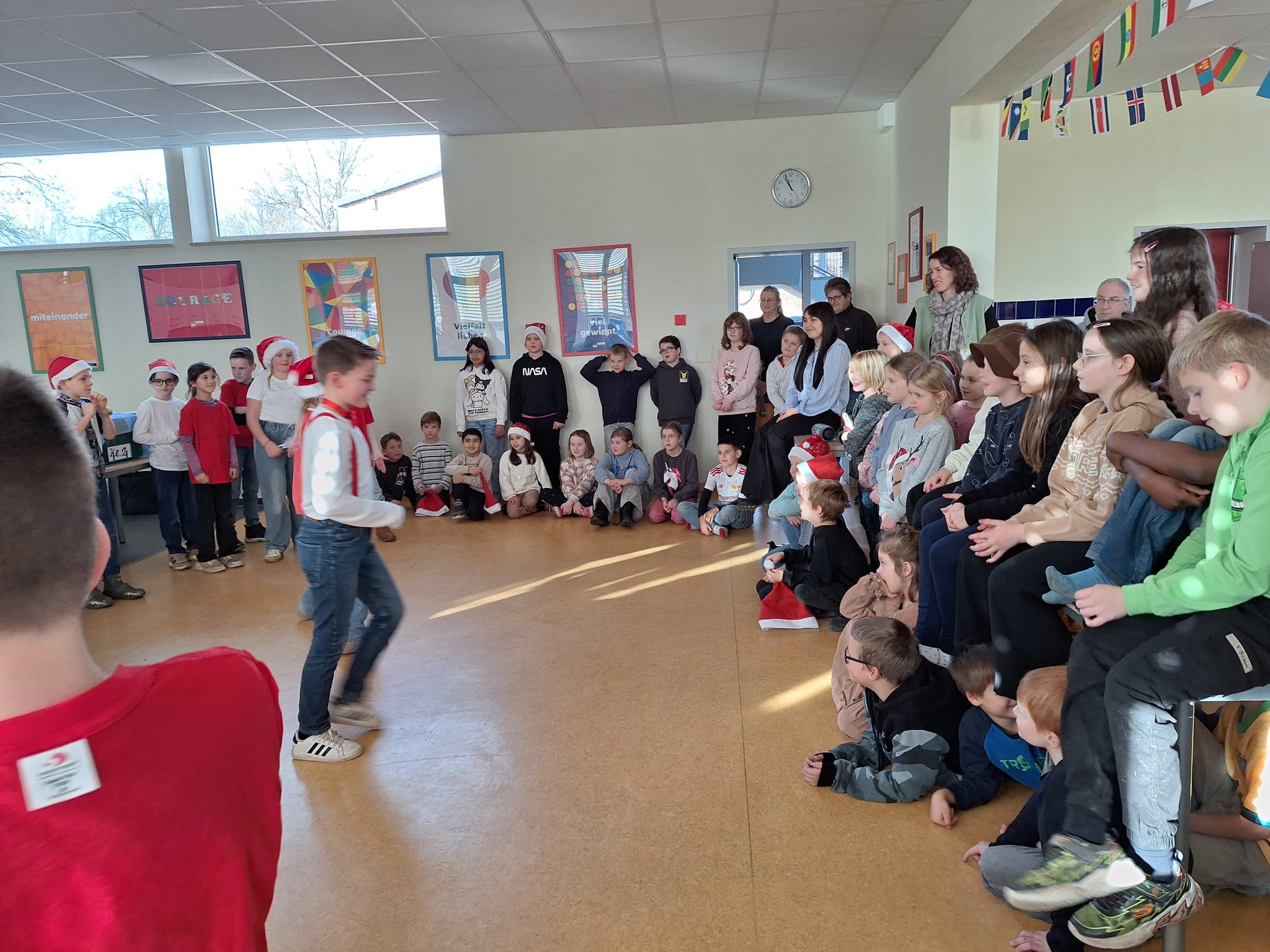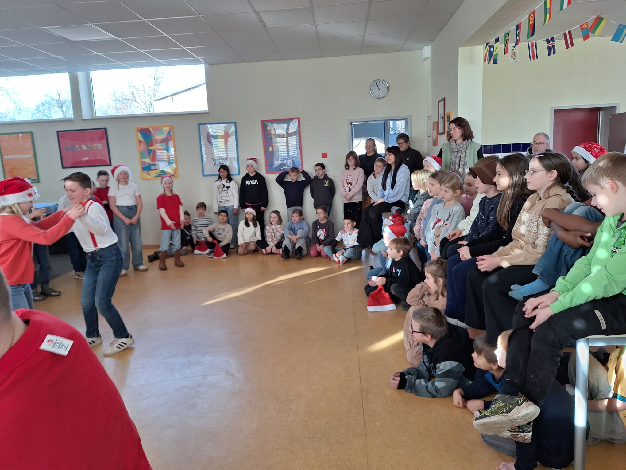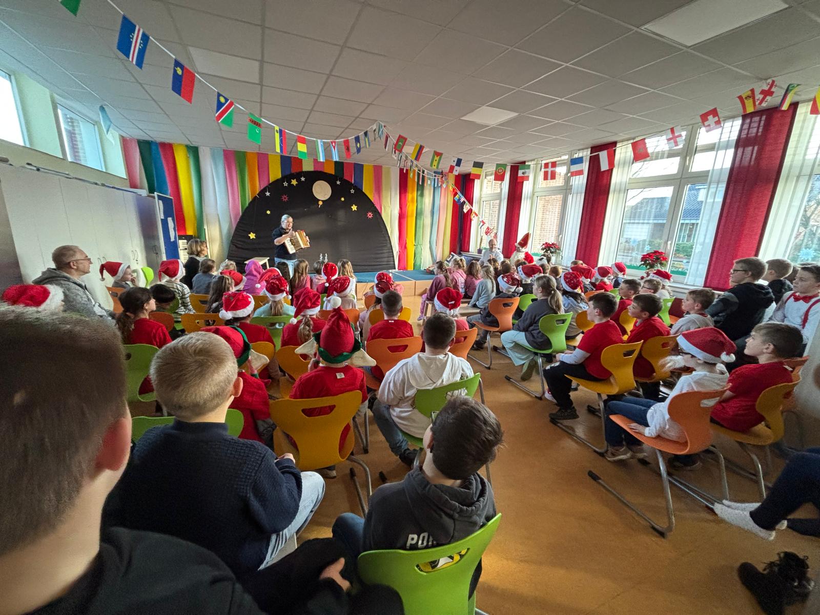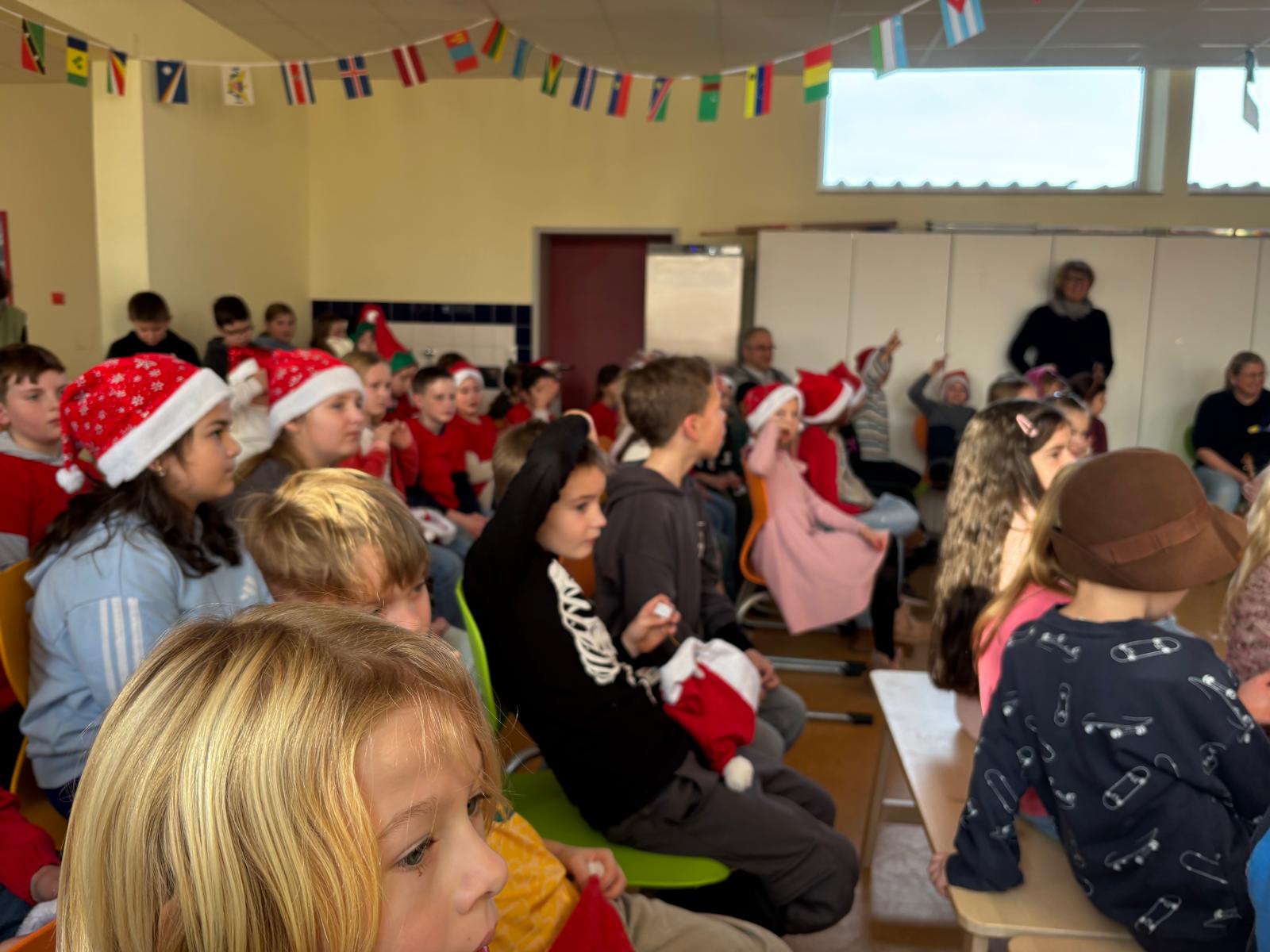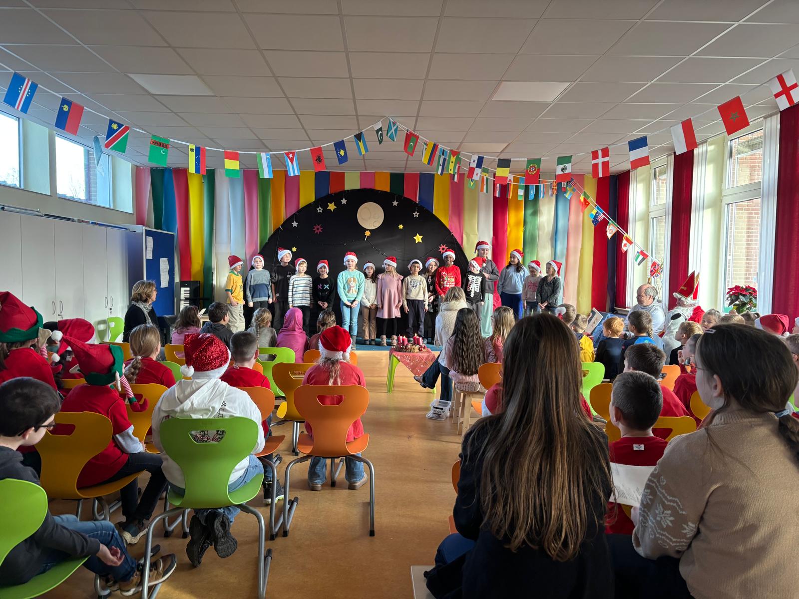 Doch vorher lauschte er andächtig den Aufführungen der Kinder. Klasse 1 spielte ein kleines Weihnachtsstück, die Klasse 2 präsentierte die „Weihnachtsmaus“ und ein kleines Lichterlied, Klasse 3 hatte eine wunderschöne Tanzeinlage einstudiert und Klasse 4 sprach feierlich ein Gedicht und zeigte einen fetzigen Engelrap – der Nikolaus war sehr zufrieden und hatte auch für die Mitarbeiterinnen der Schule kleine Geschenke zum Dank für ihre wertvolle Arbeit mit den Kindern im Gepäck. Dankeschön lieber Nikolaus für deinen Besuch – und selbstverständlich danken wir an dieser Stelle auch unserem Förderverein für die Unterstützung!